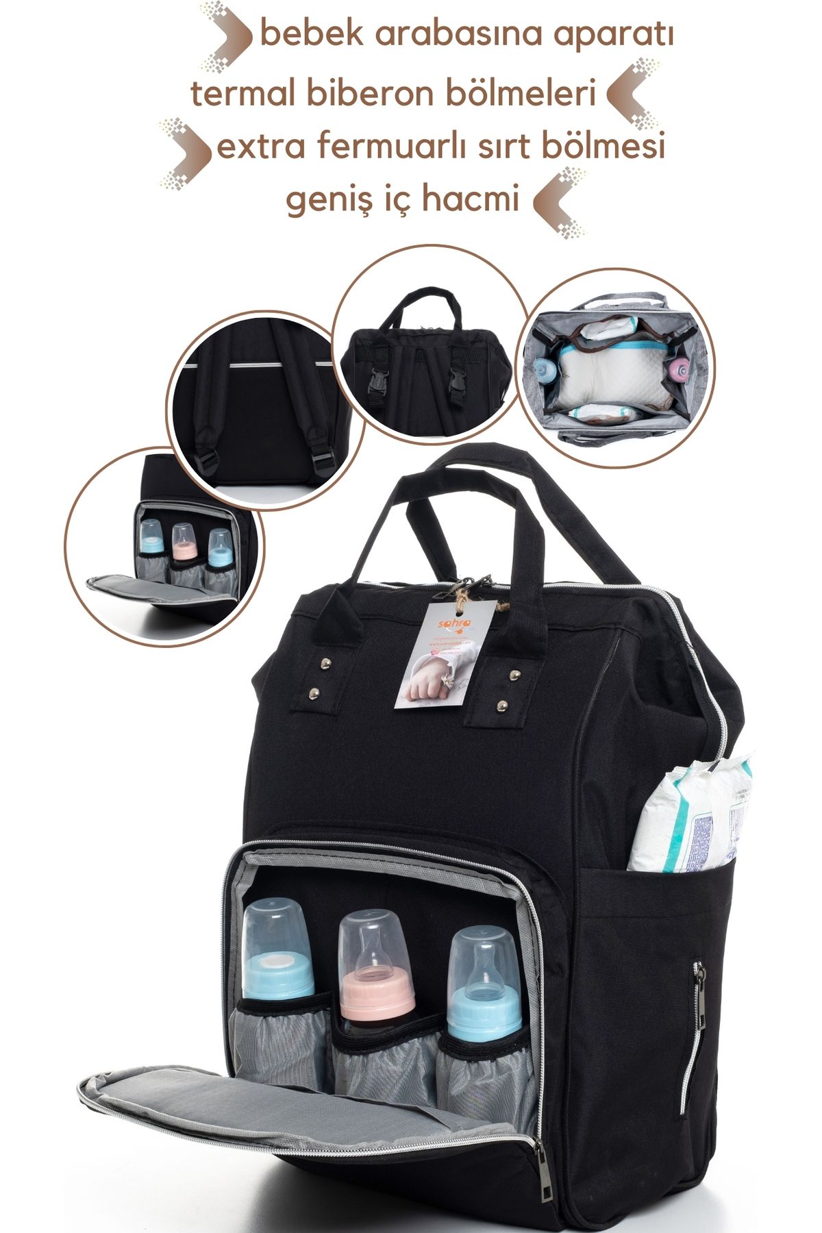 Bebek Bakım Sırt Çantası; El çantası, sırt çantası ve bebek arabasına takılarak fonksiyonel olarak kullanım kolaylığı sağlar. Birinci sınıf özel keten kumaşlardan üretilmiştir. Su geçirmez ve leke tutmaz özelliktedir. 3 biberona kadar hacmi olan termal bölmeli sıvı saklama alanı mevcuttur.