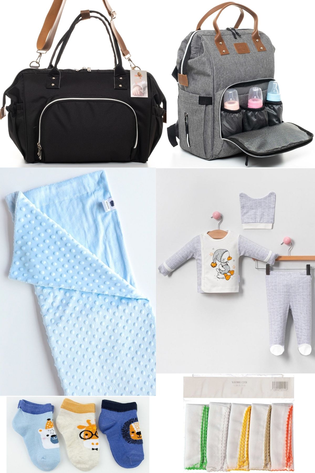 6’lı Bebek Doğum Seti (Hastane Çıkışı, Anne-Bebek Bakım Omuz ve Sırt Çantası, Nohut Battaniye, 3’lü Çorap ve 10’lu Mendil)