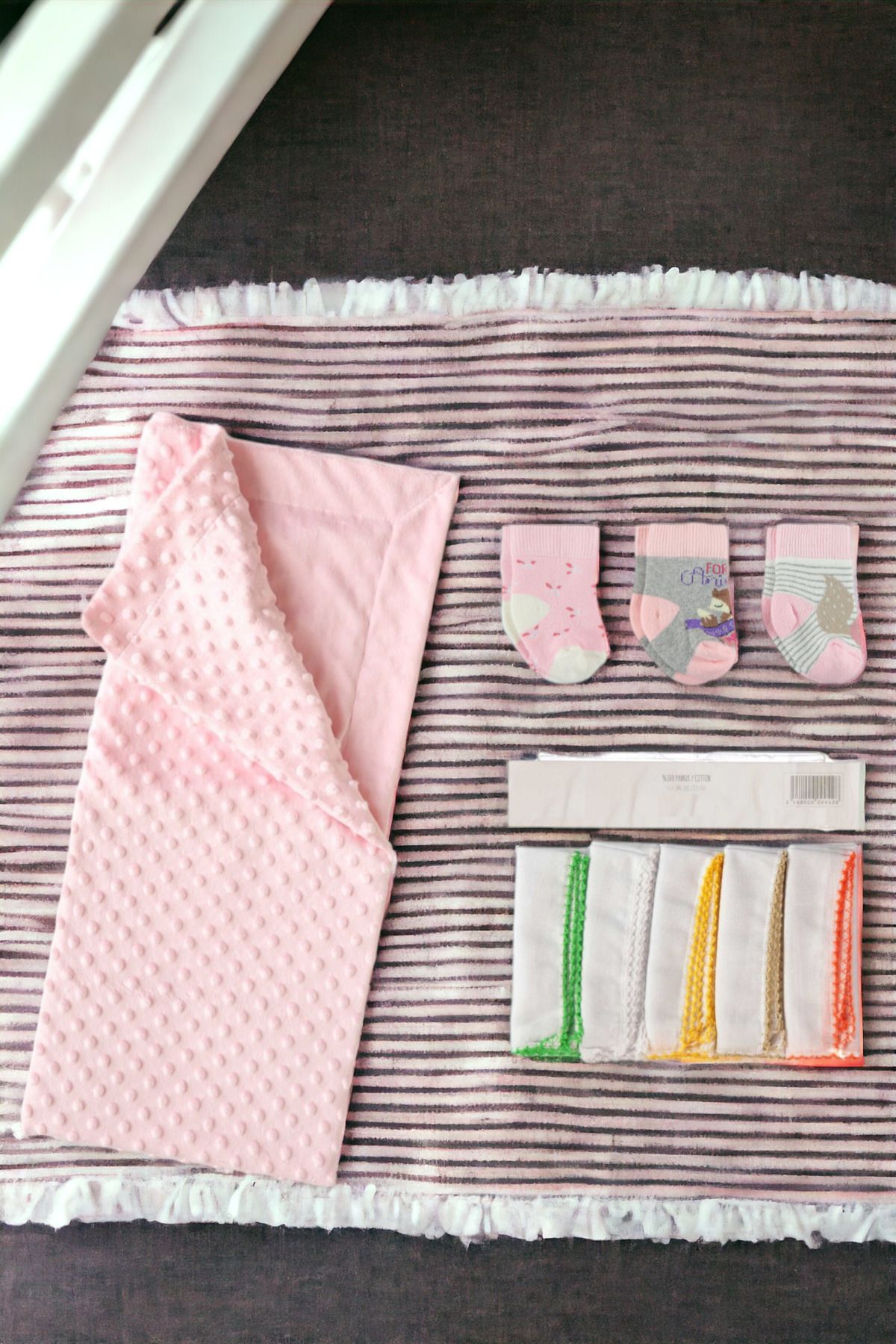 6’lı Bebek Doğum Seti (Hastane Çıkışı, Anne-Bebek Bakım Omuz ve Sırt Çantası, Nohut Battaniye, 3’lü Çorap ve 10’lu Mendil)