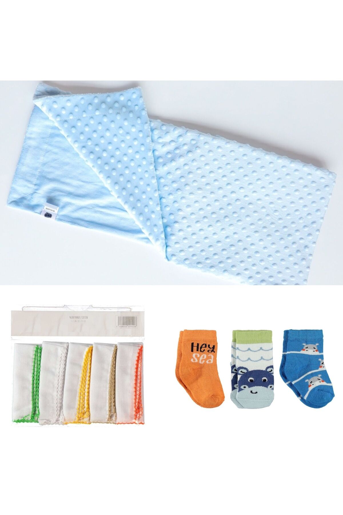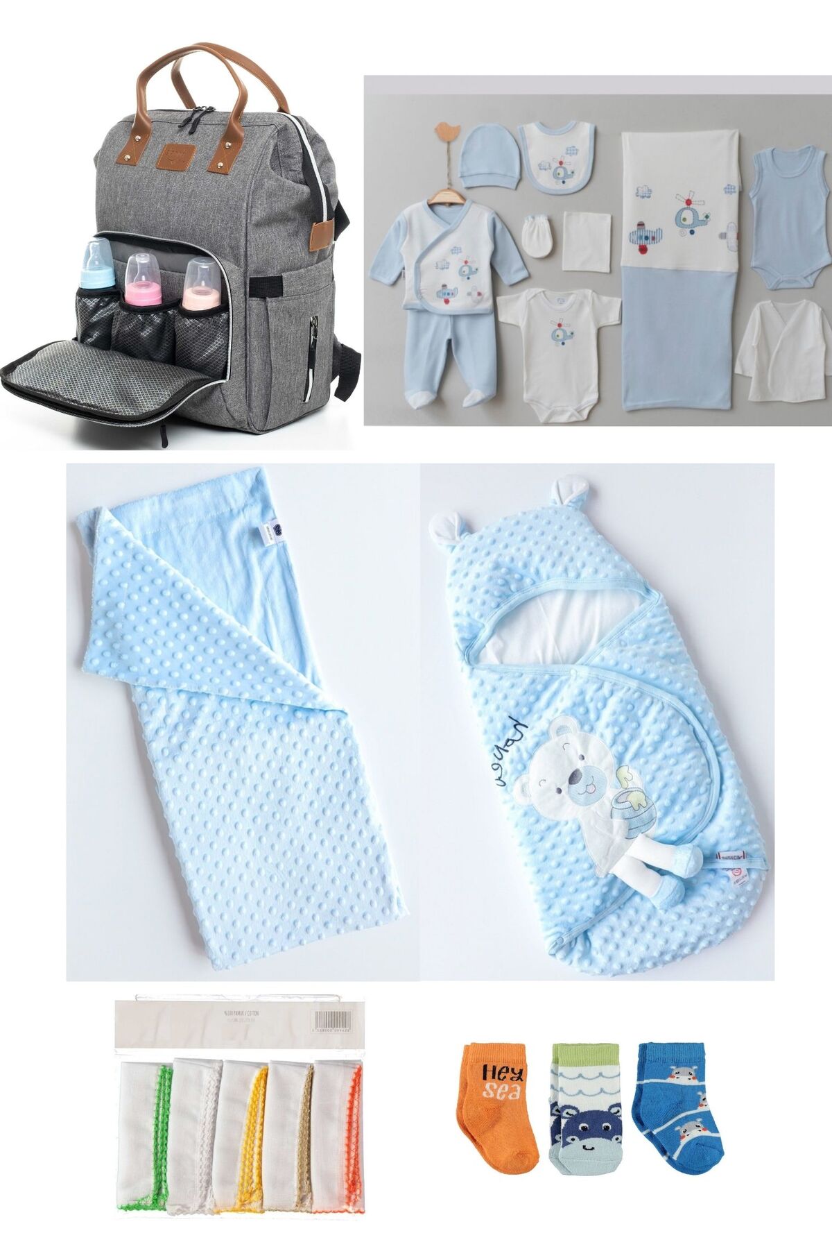 6’lı Bebek Doğum Seti (Hastane Çıkışı, Anne-Bebek Bakım Omuz ve Sırt Çantası, Nohut Battaniye, 3’lü Çorap ve 10’lu Mendil)