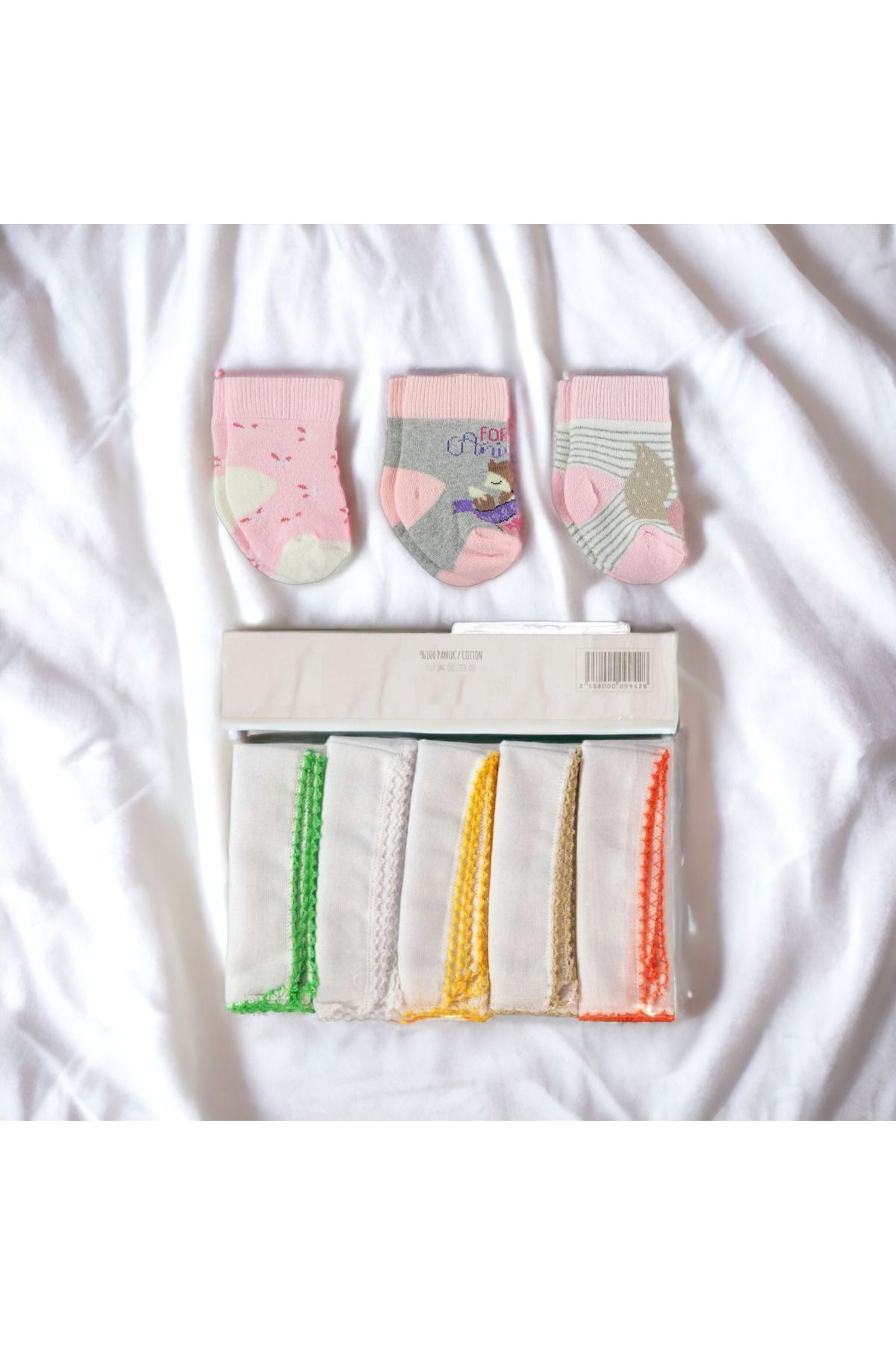 6’lı Bebek Doğum Seti (Hastane Çıkışı, Anne-Bebek Bakım Omuz ve Sırt Çantası, Nohut Battaniye, 3’lü Çorap ve 10’lu Mendil)