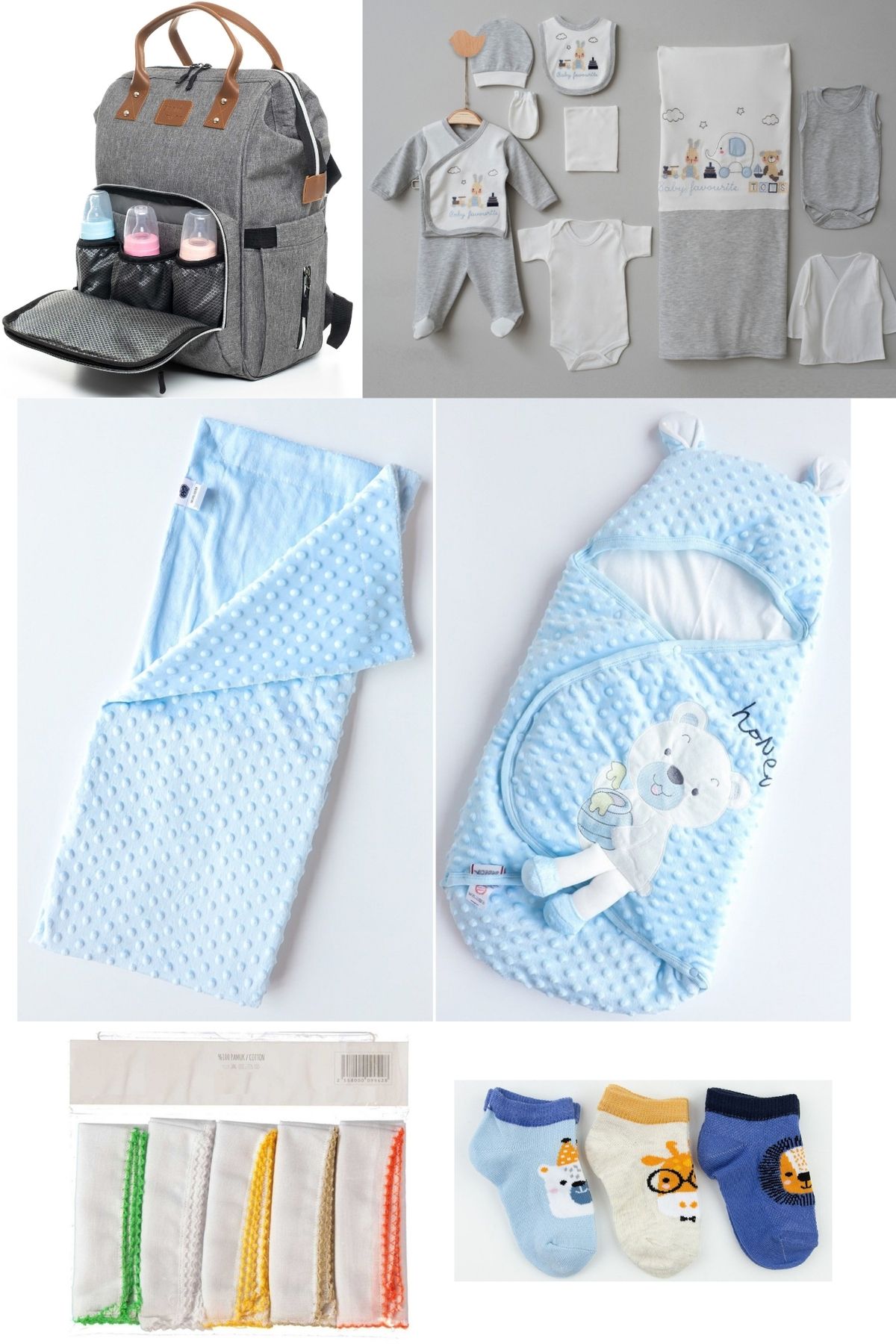 6’lı Bebek Doğum Seti (Hastane Çıkışı, Anne-Bebek Bakım Omuz ve Sırt Çantası, Nohut Battaniye, 3’lü Çorap ve 10’lu Mendil)