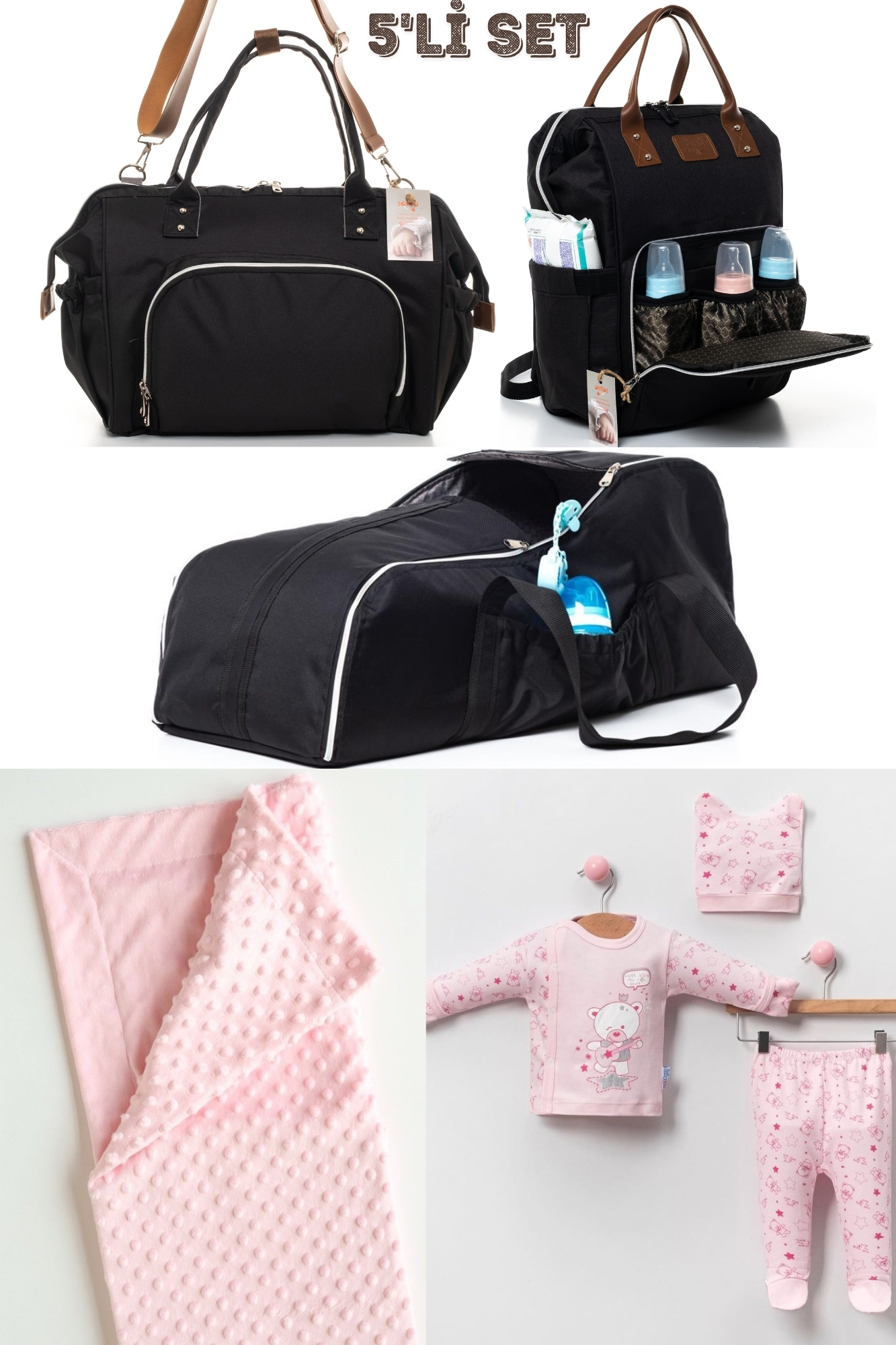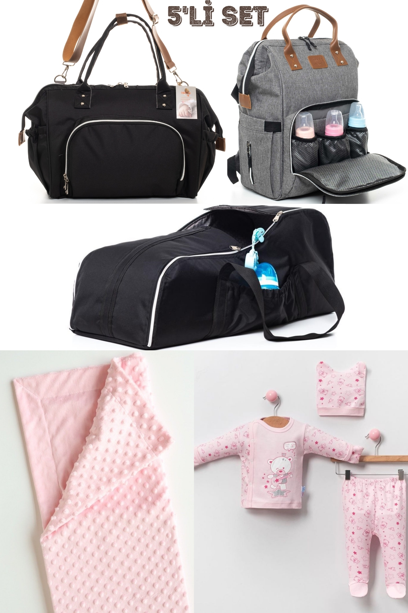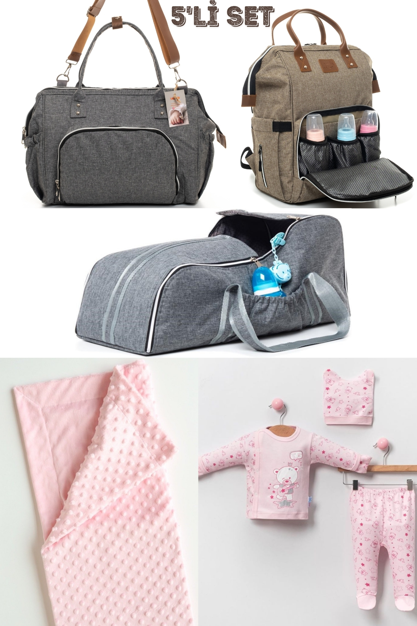 Büyük Doğum ve Bebek Taşıma Seti içerisinde Anne Bebek Bakım Omuz ve Sırt Çantası, Portbebe, Hastane Çıkışı, Nohut Battaniye bulunmaktadır.